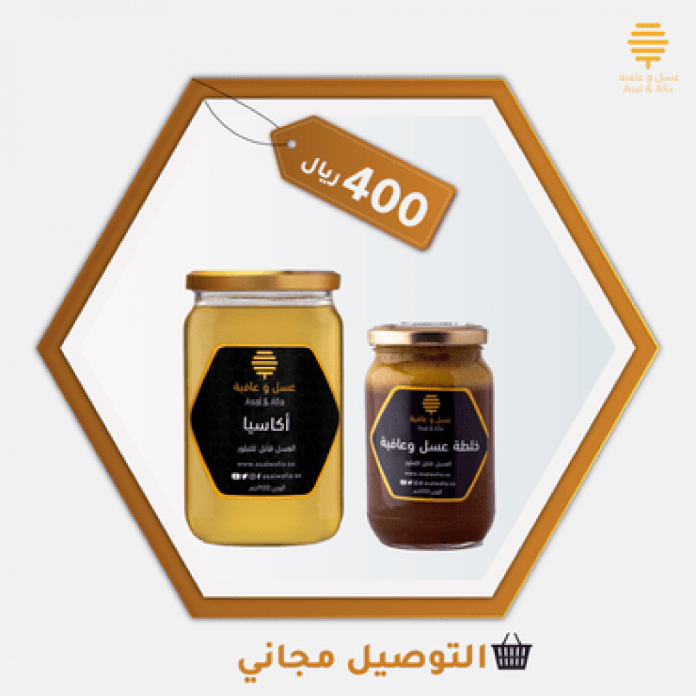 عبوة 900 غ من عسل الأكاسيا الطبيعي, مصحوبة بنصف كمية خلطة عسل وعافية الغنية بالعناصر الغذائية مثل حبوب اللقاح والغذاء الملكي والجينسنق. يجمع العرض بين الطعم الفاكهي الخفيف للأكاسيا وفوائد الخلطة لتعزيز المناعة والطاقة اليومية. مثالي للتحلية والمشروبات والوصفات الصحية.